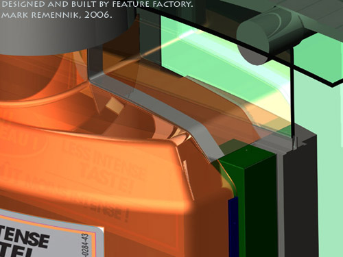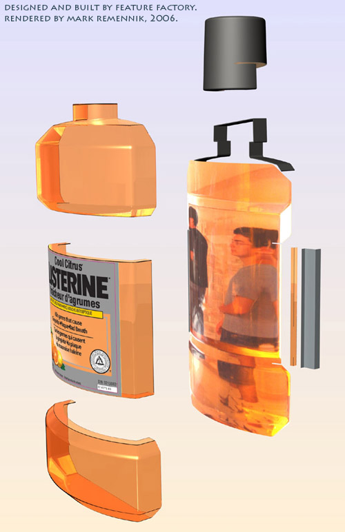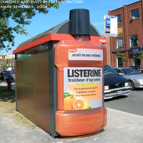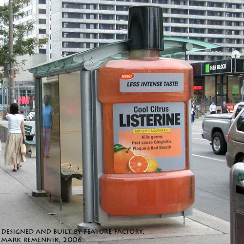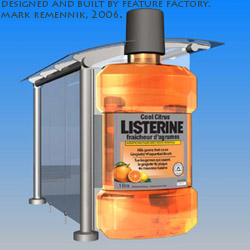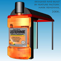 Listerine Advertisement - A 9 foot tall Listerine bottle attached to Toronto and Montreal bus shelters done by Feature Factory for Viacom. I was involved in the design, detailing and providing technical drawings for the production of this project.