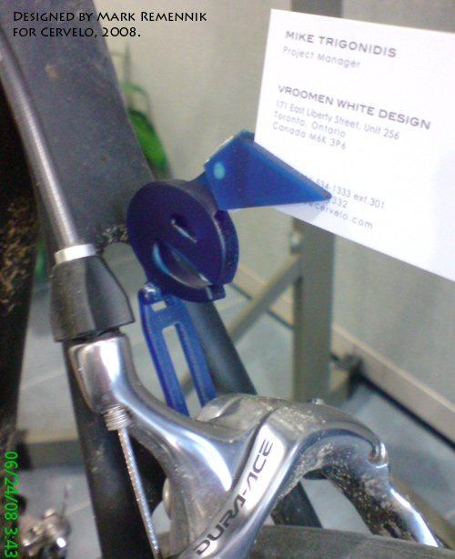 Rear Number Holder – Cervelo bicycles sold at dealers all over the world are usually displayed with a point of sale tag. This “Rear Number Holder” acts as the tag display. The design of this product uses the Cervelo logo in a clever and simple way, while maintaining a very low production cost. The information displayed stays the focus of the viewer, not the display |