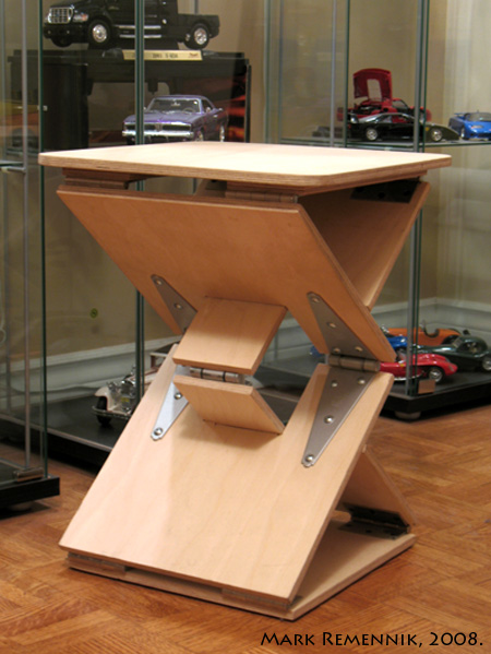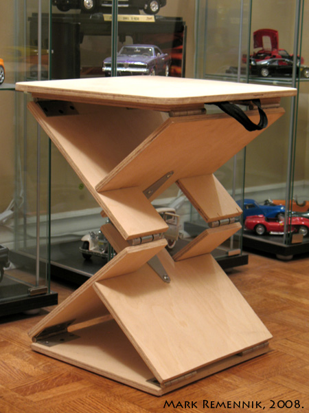 Planar Stool – This is an exercise for exploring the possibilities of using readymade materials, namely sheet material. This stool is designed using slat planes, refraining from and curved or complex surfaces. It is to be easily manufactured out of mass produced materials. I have decided to push the notion of “planar form” in this exercise by making the entire stool fold flat, and itself become a plane. |