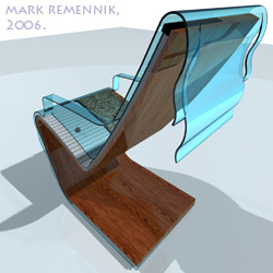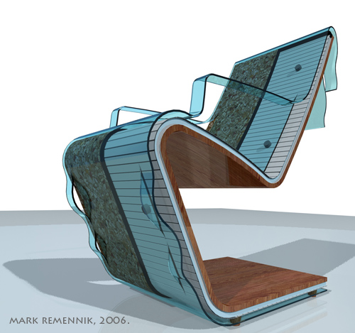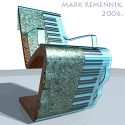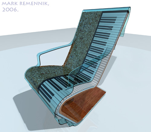 The Yanni Chair - A high end chair designed to represent the music and the personality of Yanni (a composer of ambient music). The chair includes different elements that reflect the music, such as the glass formed in waves, the organically bent electronic keyboard and the metaphor of the stones as the buttons of the electronic keyboard. The sitting position also represents Yanni's music in the lounging, and relaxed position that a listener of his music would prefer. |